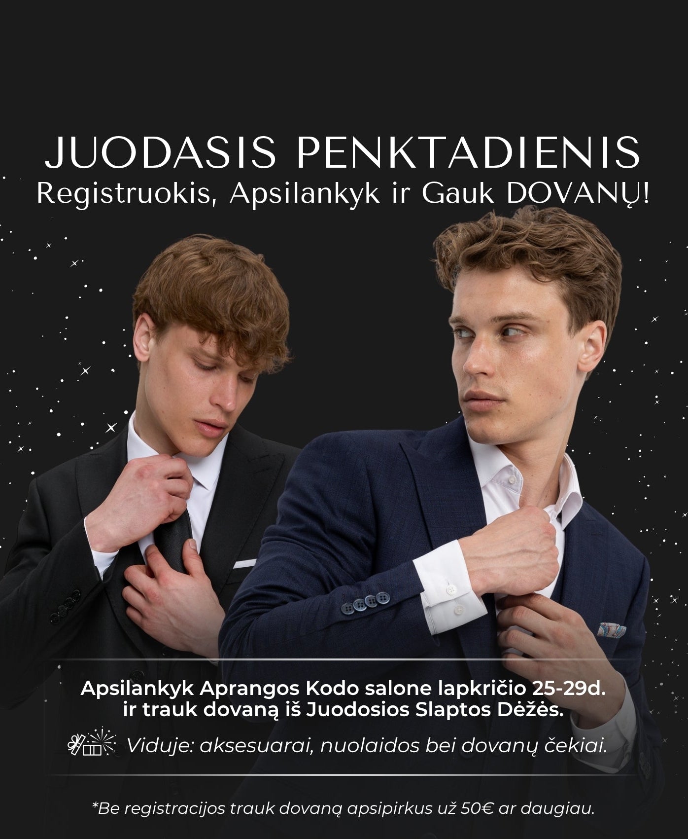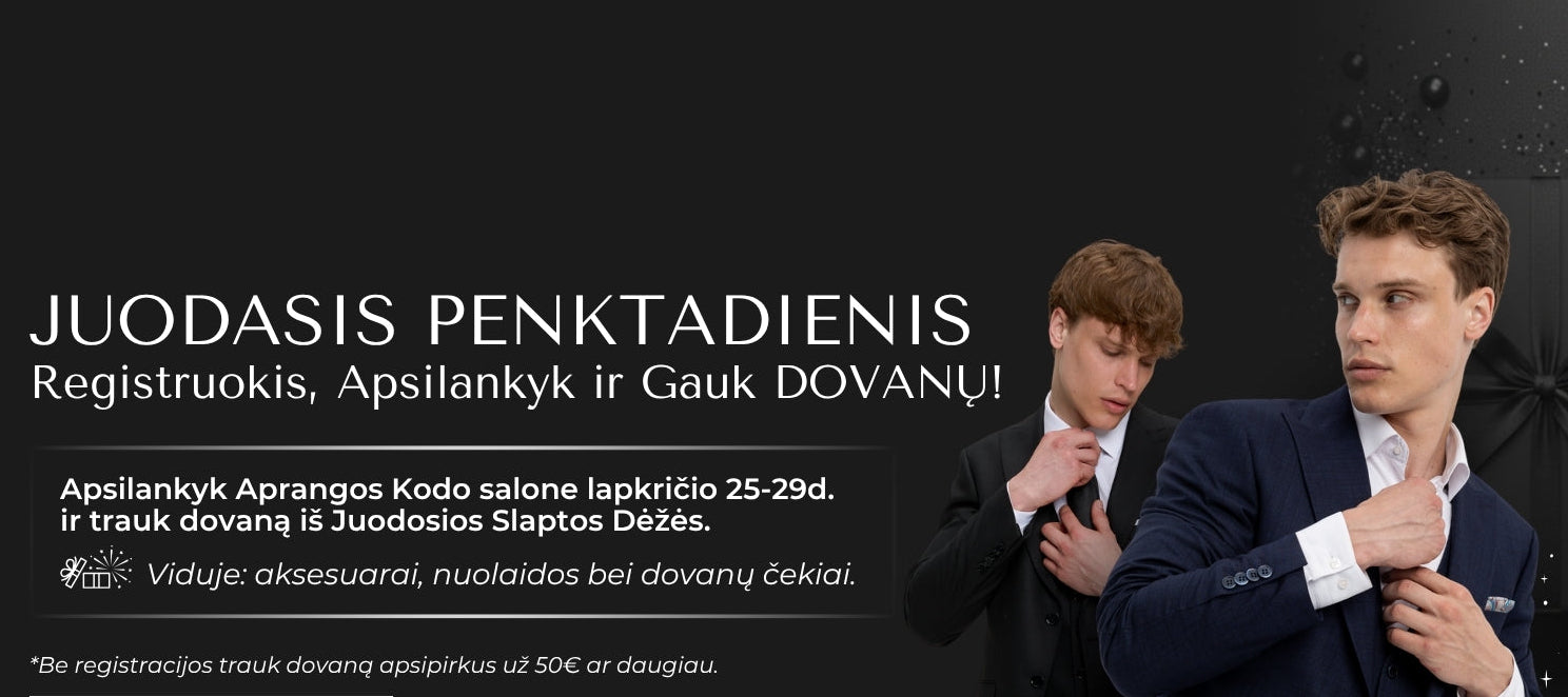 APRANGOS KODĄ sukūrėme norintiems atrasti savo šventinį, darbinį ar kasdienį stilių greitai ir užtikrintai: be daugybės apsilankymų skirtingose parduotuvėse, bet su pasitikėjimu, kad kokybiška apranga atkeliaus iš patikimų rankų. Esame šeimos verslas, kuriam rūpi audinių kokybė ir naujausios mados tendencijos. Dirbame tam, kad mūsų parduotuvėse rastumėte kostiumą, kuris papuoš ir tarnaus ilgą laiką.