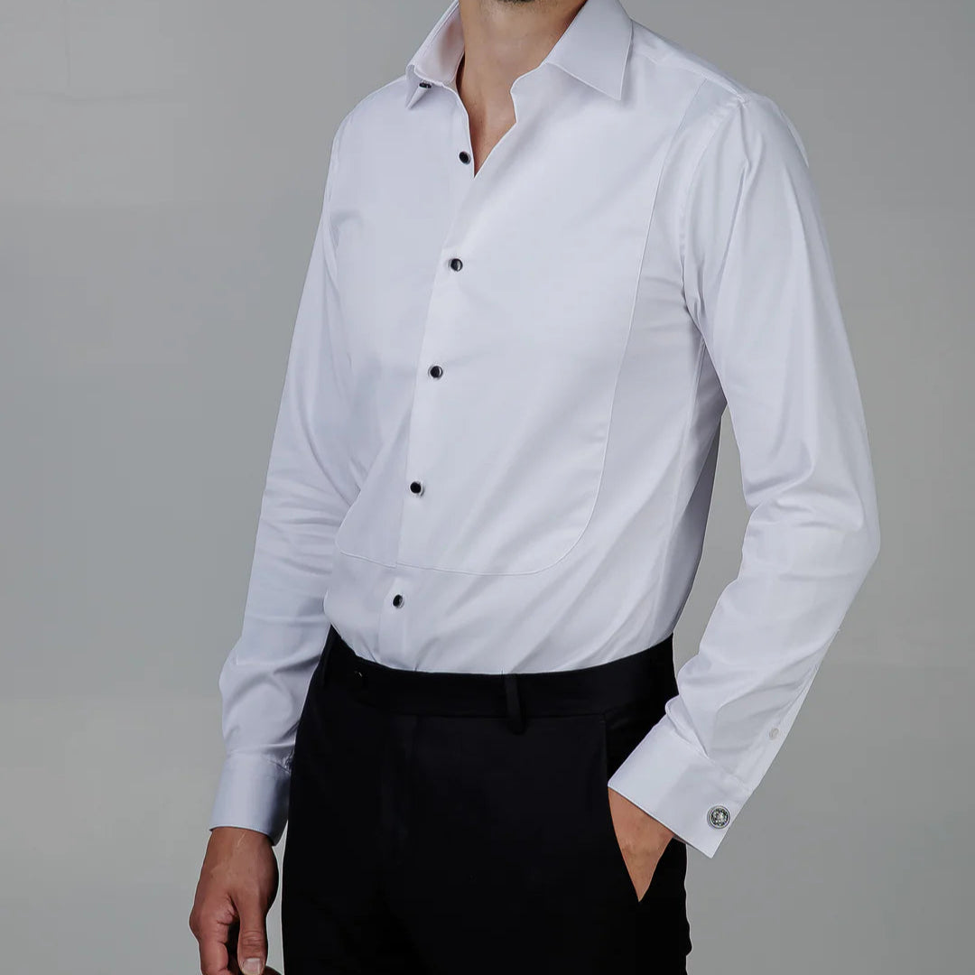 Balti, aukštos kokybės marškiniai su dvigubomis rankogalių sagomis – būtinas elementas. Dažniausiai pasirenkamas smokinginis apykaklės tipas arba klasikinė atverčiama apykaklė.