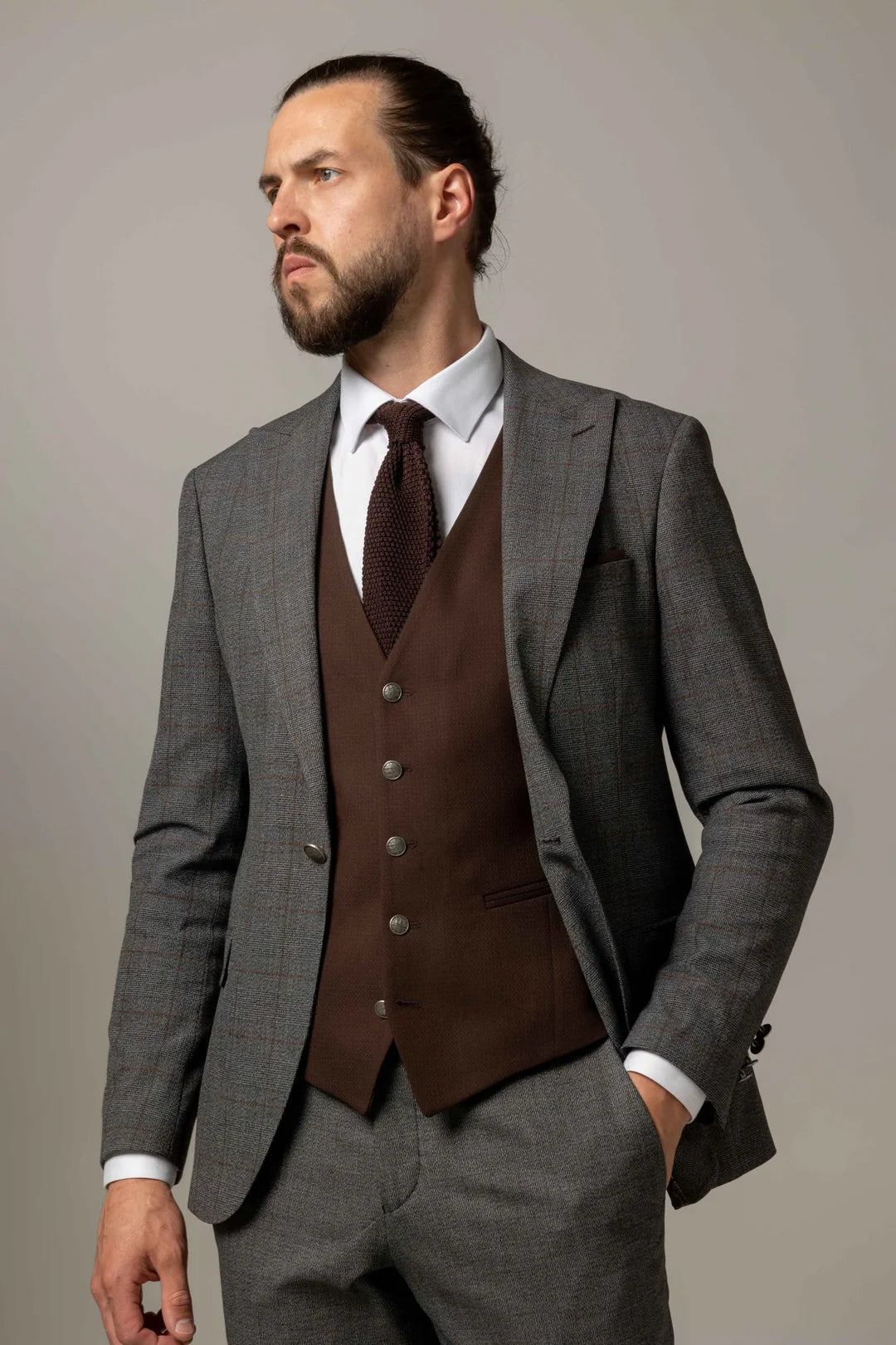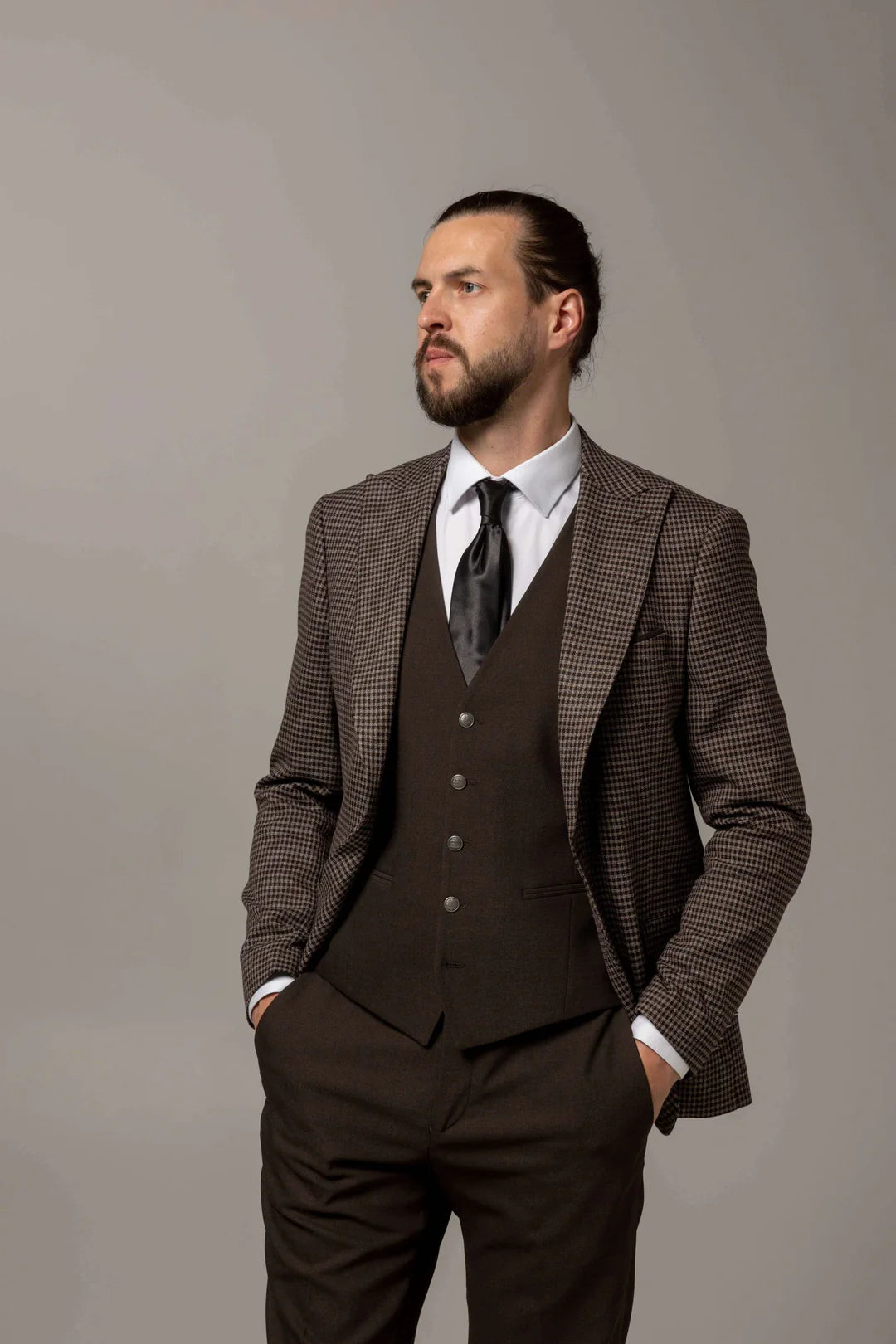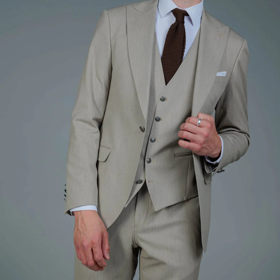 Jei pasirinkote trijų dalių kostiumą, liemenė turėtų būti iš to paties audinio ir spalvos kaip švarkas ir kelnės. Tai sukuria vientisą ir solidų įvaizdį, tinkantį oficialioms vestuvėms.
