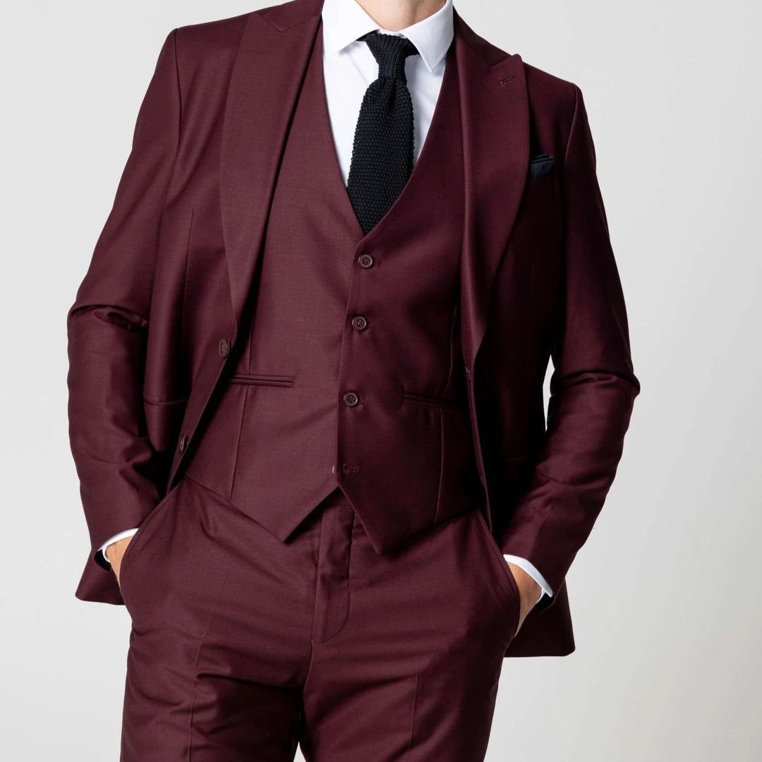 - Tamsiai mėlynas arba burgundiškas kostiumas su atitinkančia liemene