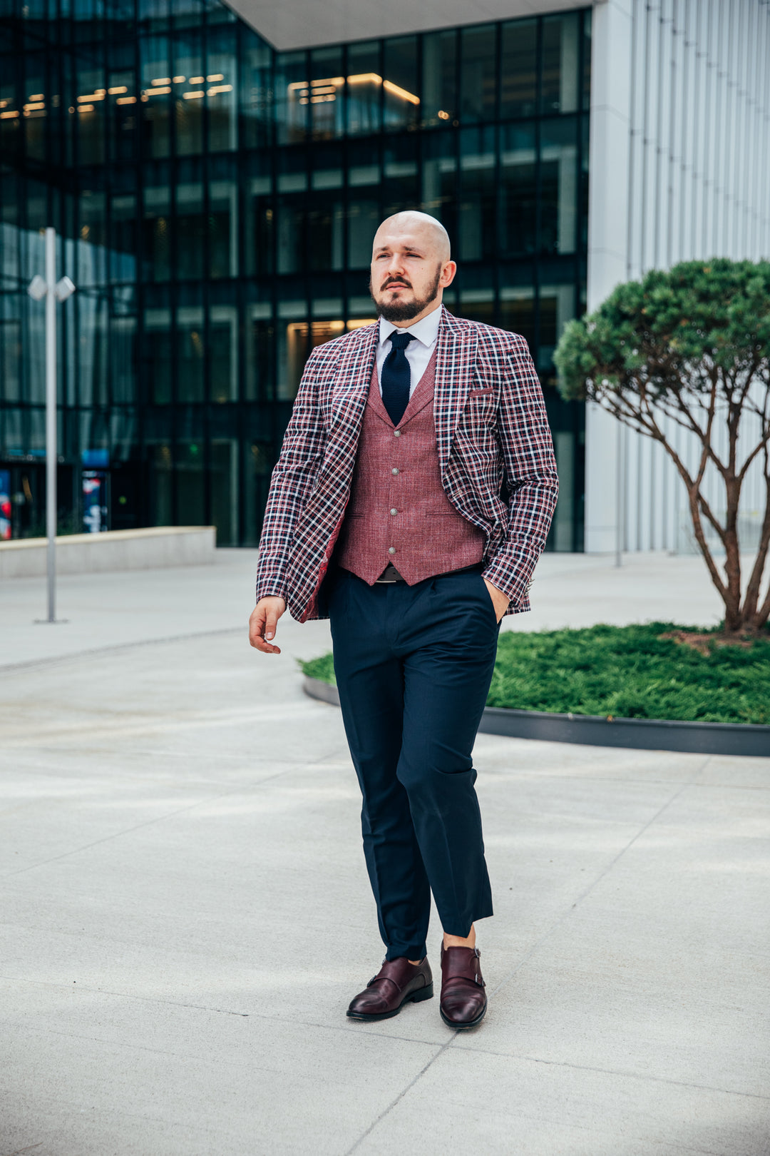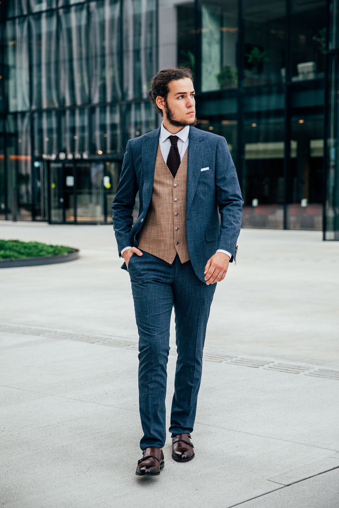 Tai didžiausią iššūkį keliantis derinys, nes jūs turite derinti tris skirtingas spalvas ar atspalvius – kelnes, švarką ir liemenę. Kurkite tokį derinį tik tada, kai esate tikri, jog jis atrodys gerai.Jei norite prie šio derinio pridėti kaklaraištį, rinkitės tokį, kuris harmoningai derėtų su liemenės ar švarko raštu.