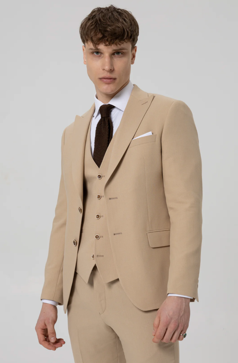 Kreminės spalvos kostiumas yra puikus pasirinkimas rudeniui, suteikiantis stilingą išvaizdą. Neutralus jo tonas puikiai dera su įvairiais aksesuarais ir gali būti priderintas prie tinkamos liemenės. Jį galite derinti su tamsiais marškiniais ir kaklaraiščiu.