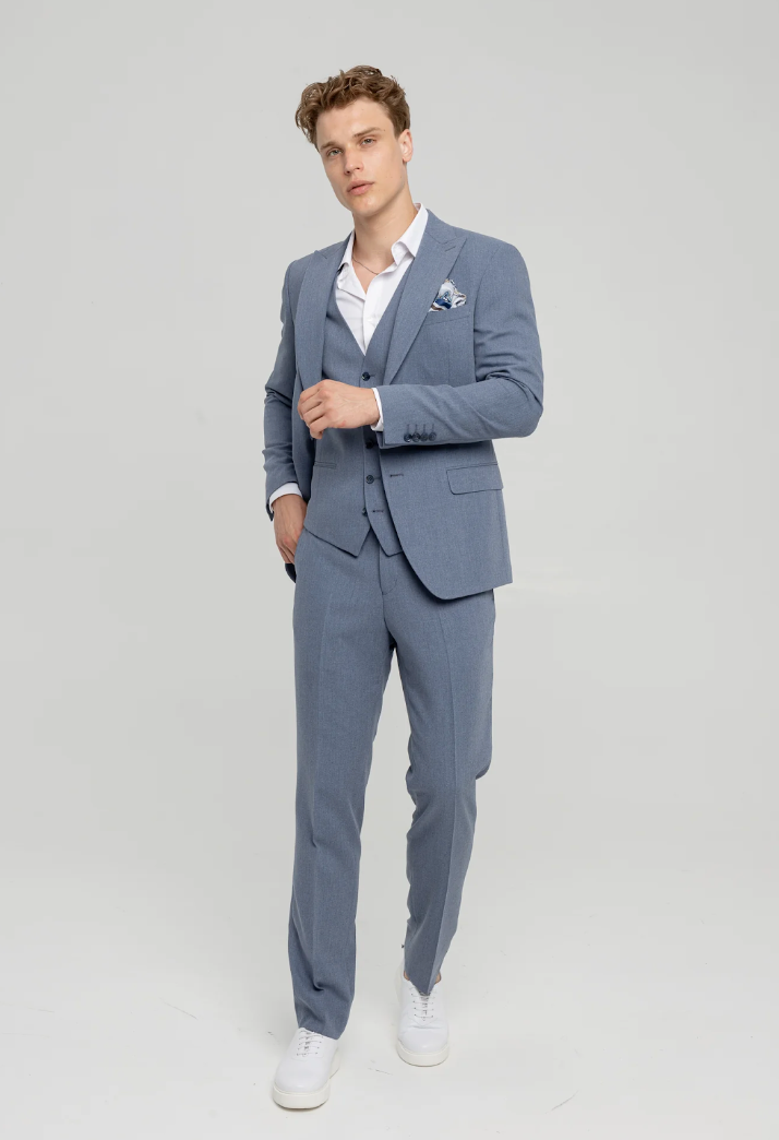 Trijų dalių mėlynas kostiumas su smulkiomis linijomis